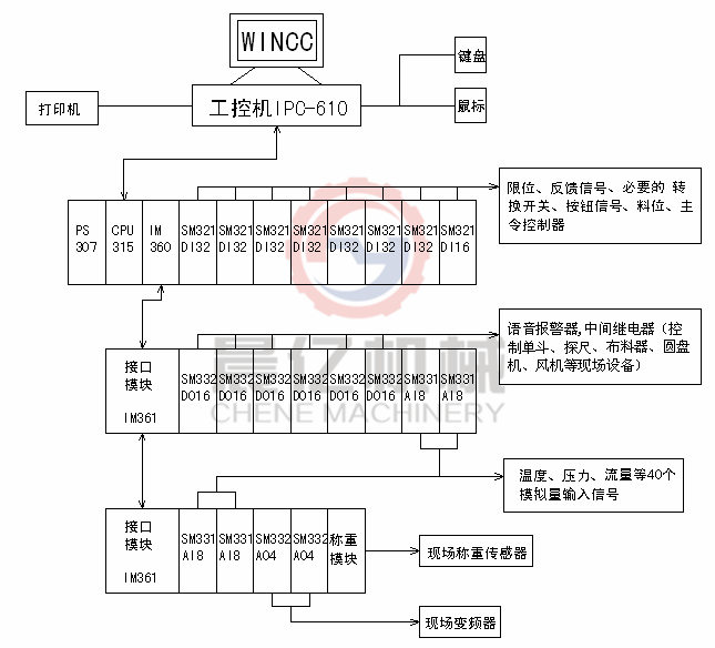 系統(tǒng)采用兩級微機控制系統(tǒng)。上位機為研華工業(yè)控制機,下位機的控制核心部分采用西門子DCS(智能化中央集控)系統(tǒng),其中含有數(shù)字量輸入輸出模塊,模擬量輸入輸出模塊,通訊模塊,接口模塊,集成的稱重模塊,系統(tǒng)操作界面采用德國WINCC人機接口軟件,探尺用智能探位儀,上料系統(tǒng)采用變頻器控制,智能控制器,智能語音報警器。